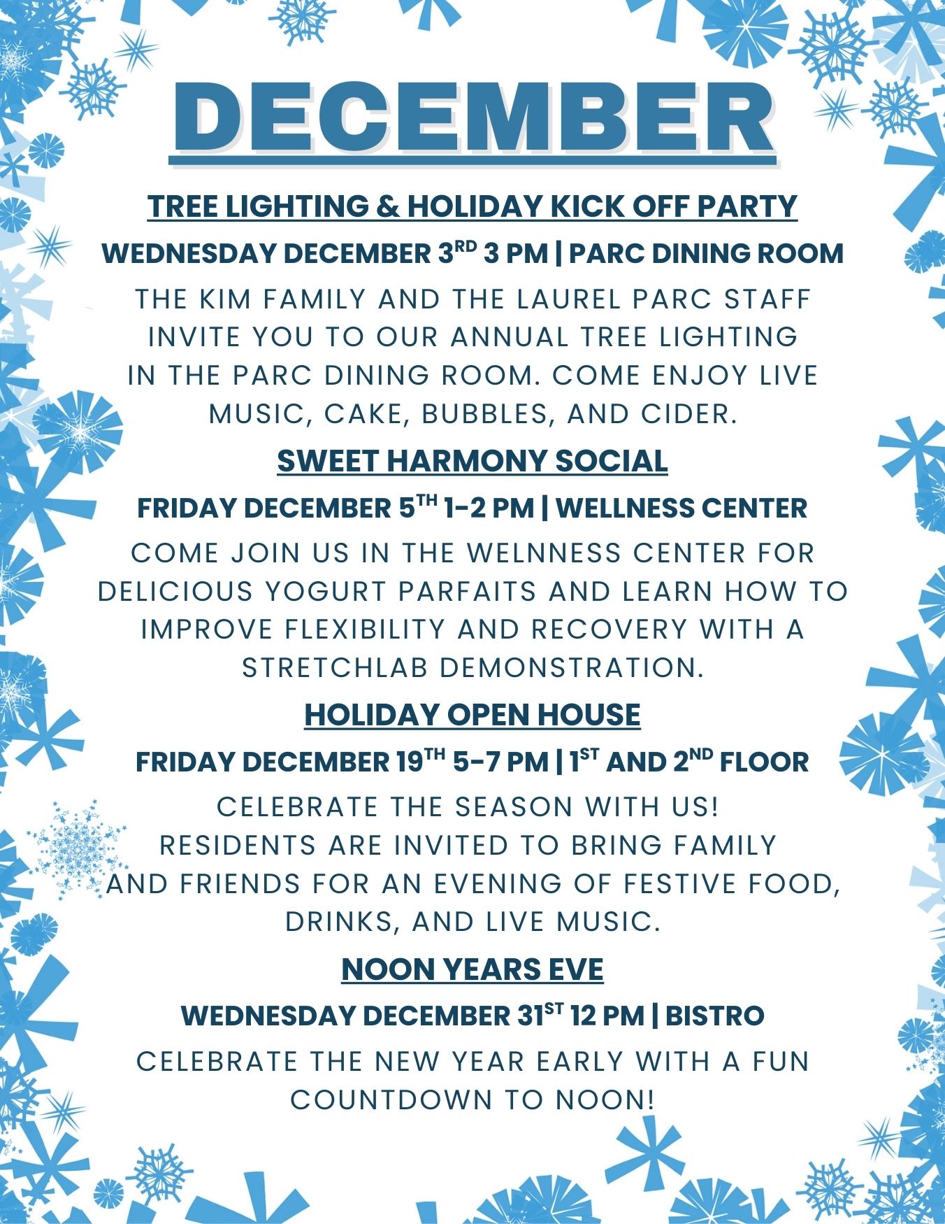 There’s always something happening at Laurel Parc! Residents can enjoy scenic drives, weekly dining events, creative crafts, walking club, and classic games like bean bag toss, bridge, and rummy. This season also brings exciting holiday celebrations and special events you won’t want to miss. Click below to see our upcoming events and RSVP today!