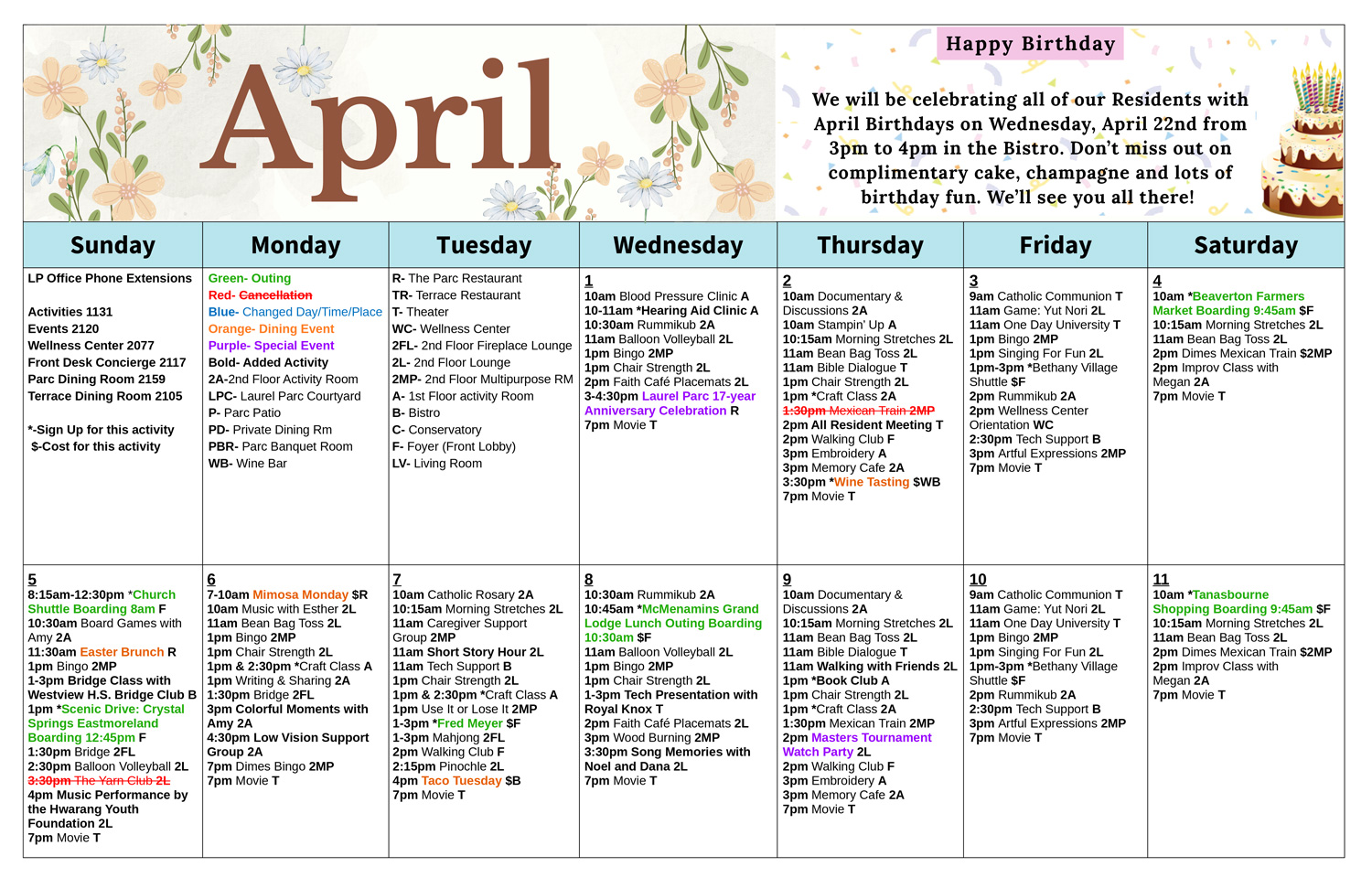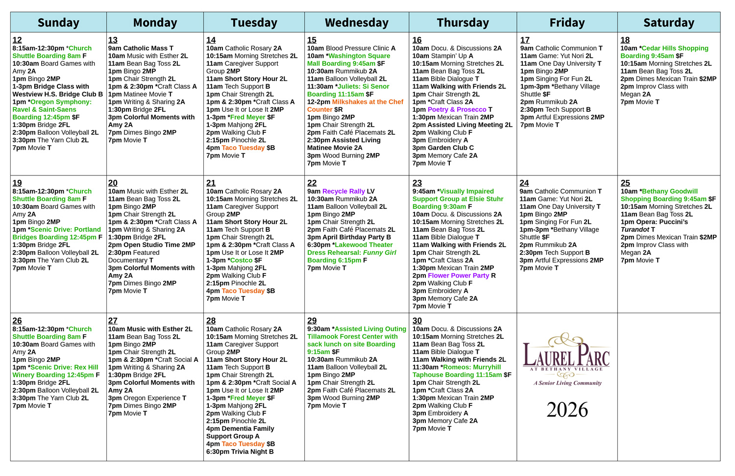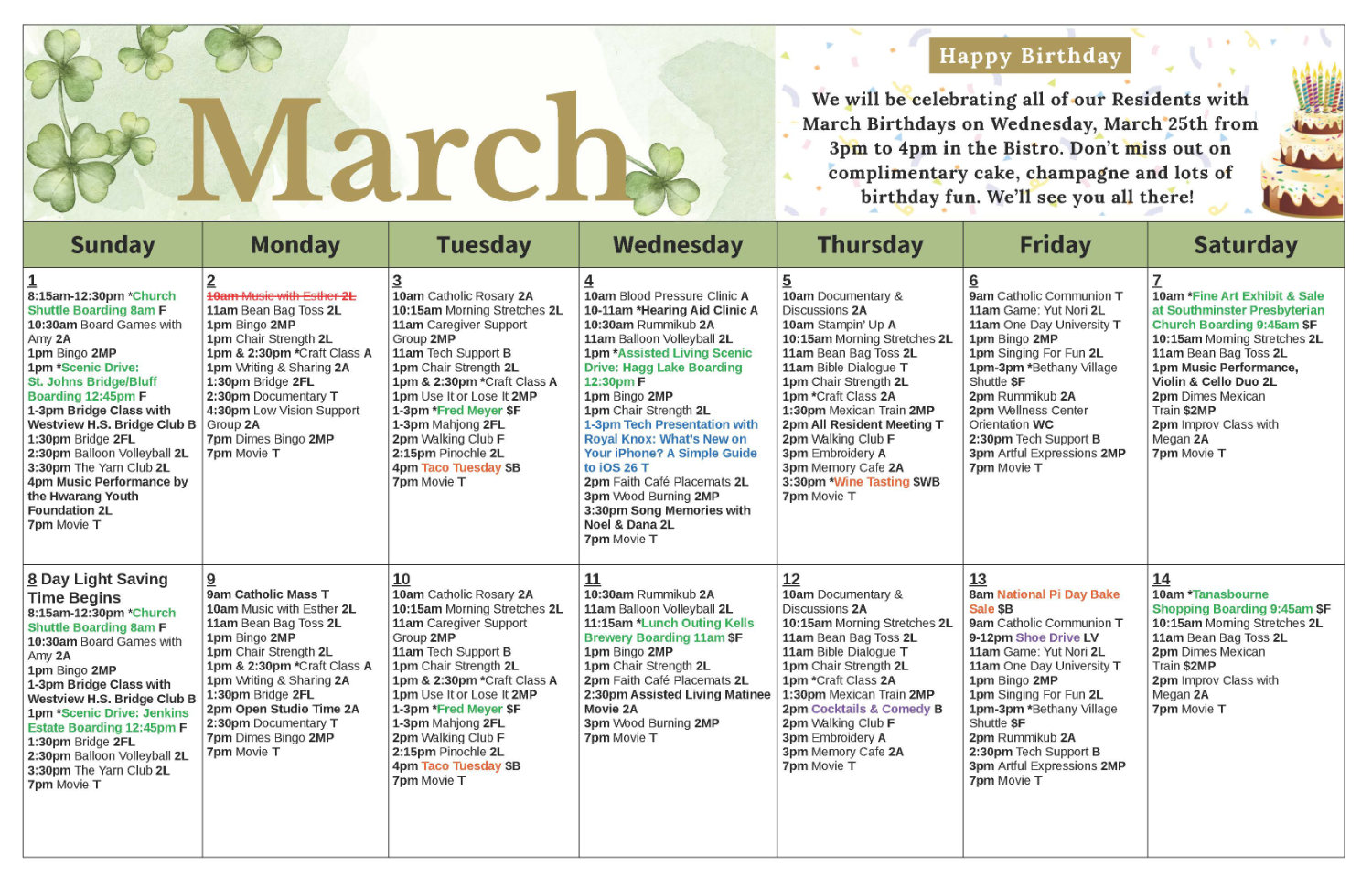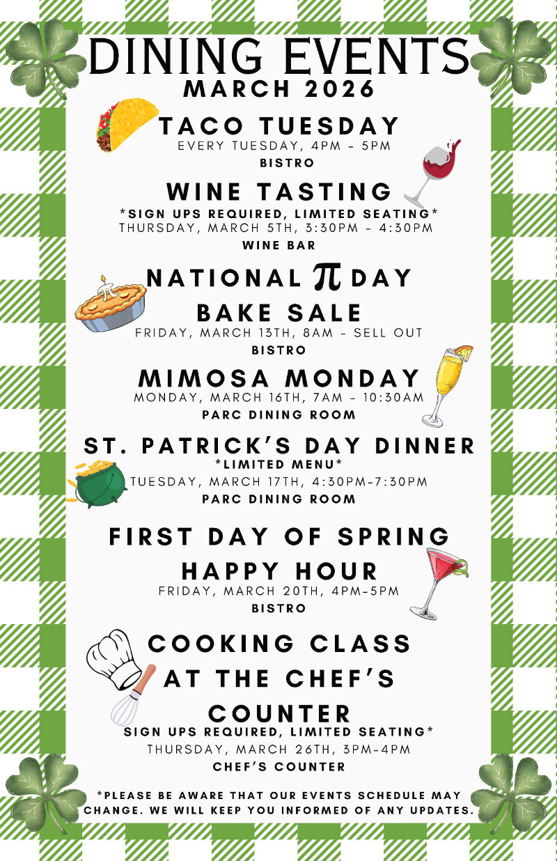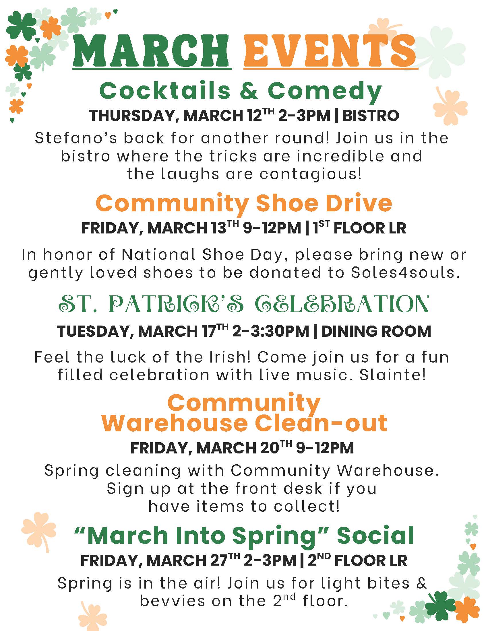 There’s always something happening at Laurel Parc! Residents can enjoy scenic drives, weekly dining events, creative crafts, walking club, and classic games like bean bag toss, bridge, and rummy. This March also brings exciting celebrations and special events you won’t want to miss. Click below to see our upcoming events and RSVP today!